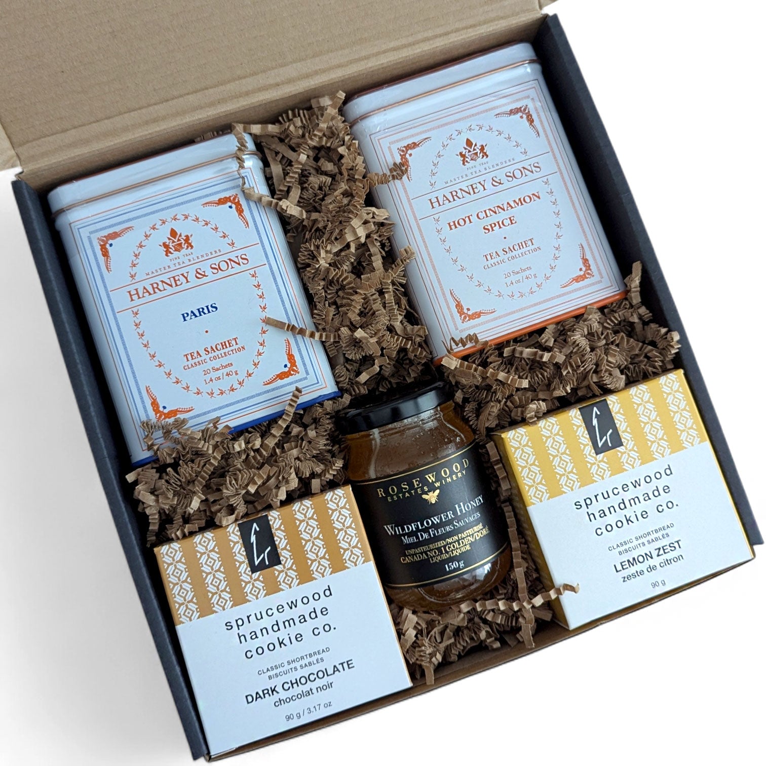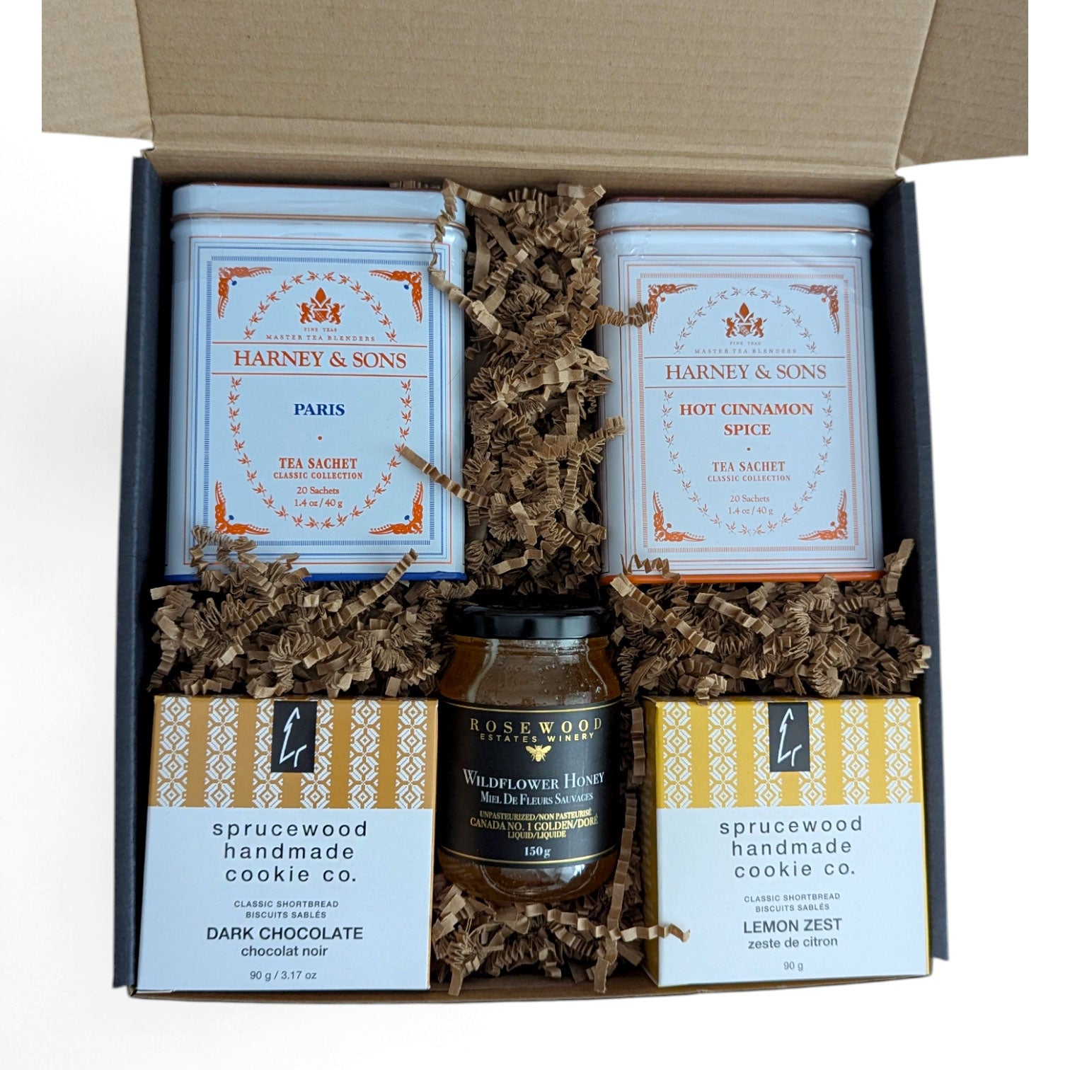 Indulge in a thoughtfully curated set of products delivering comfort and quality for your teatime moments. Savour the refined flavours of premium Harney & Sons Classic collection best-selling teas, perfectly paired with rich, buttery shortbread and naturally sweet, locally crafted honey from the Niagara Region. Whether enjoyed as a quiet moment of relaxation or shared with others, this collection brings together timeless taste and simple luxury in every cup and bite.