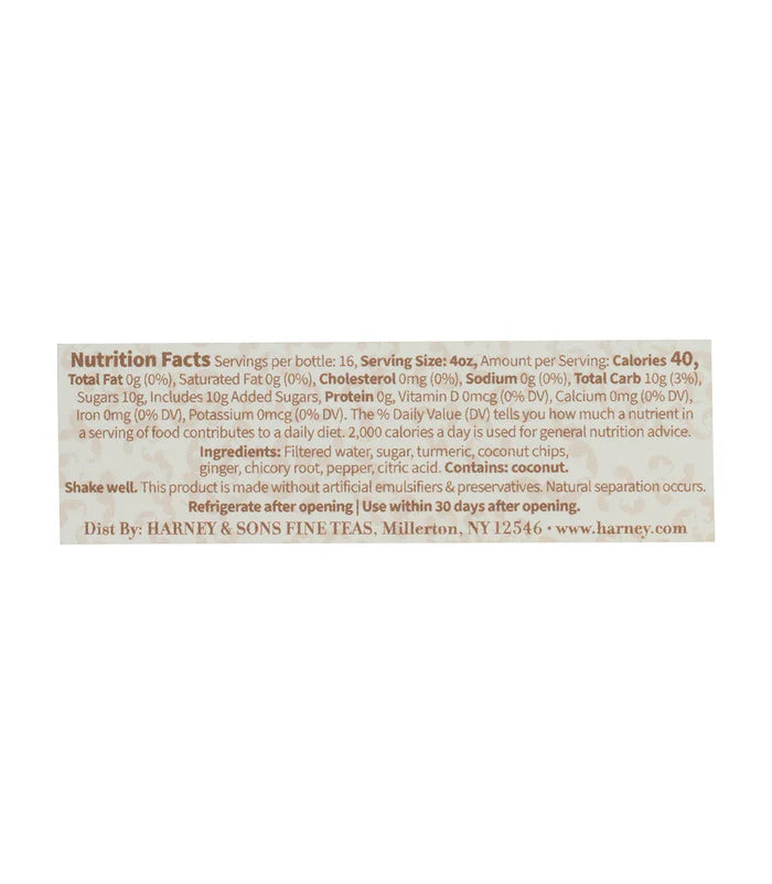 Directions: Mix equal parts liquid Harney & Sons Ginger Turmeric concentrate with milk or milk substitute. Serve and enjoy an instant, pleasurable experience.